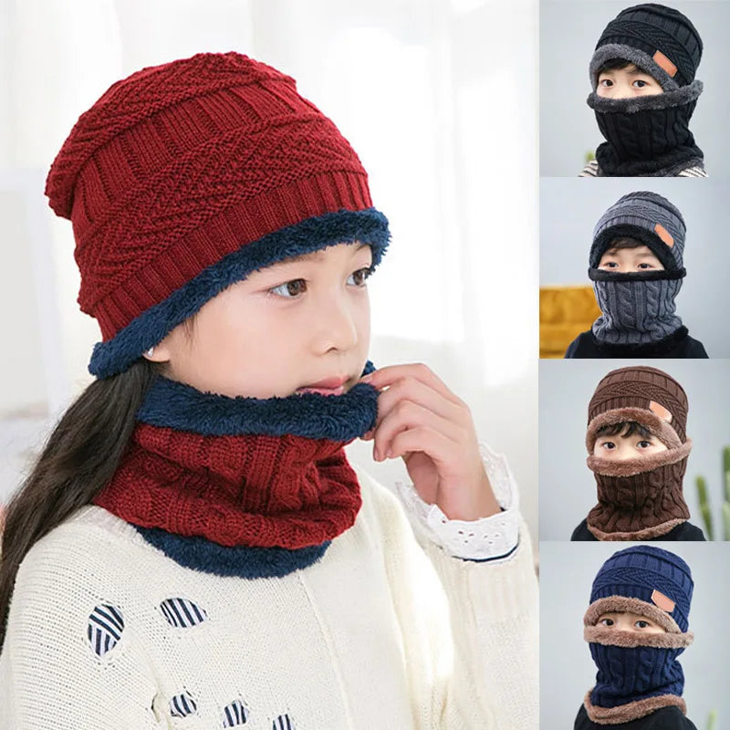 1Pcs Hat Scarf Set Kids Bean Knitted Scarf Cap Children Autumn Winter Fleece Warm Knitted Scarf Hat for Boys Girls