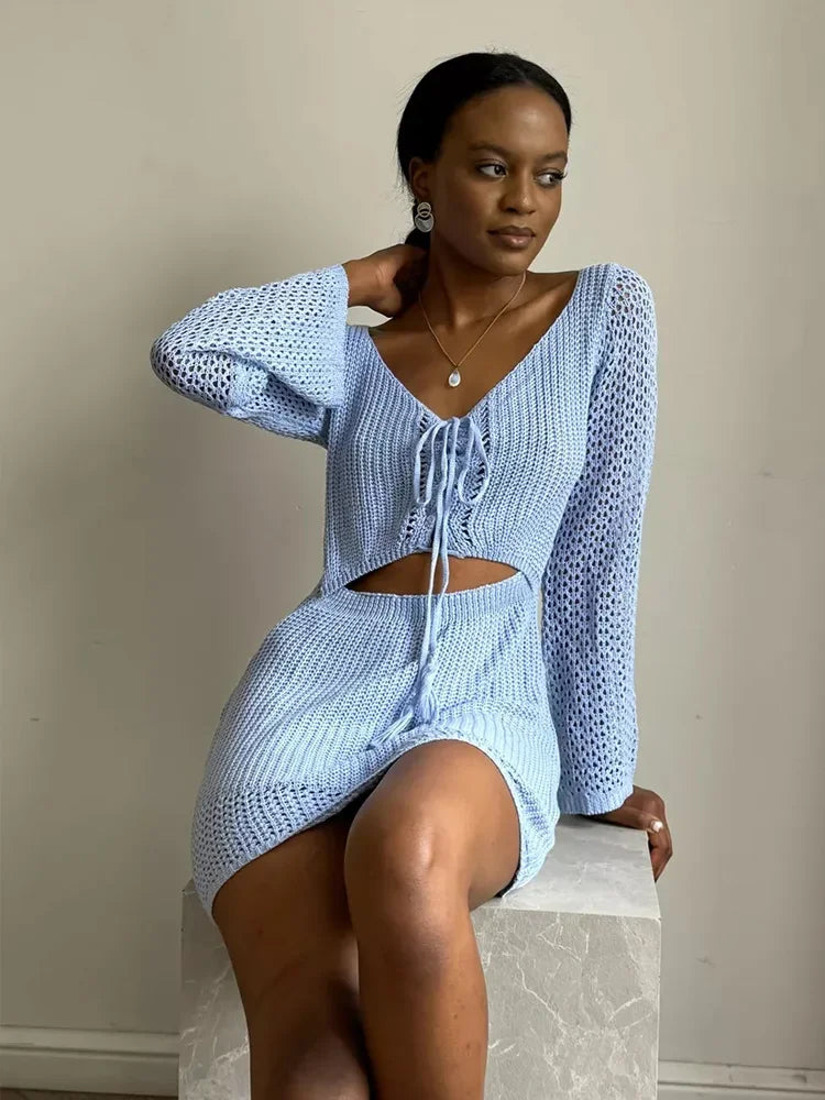2024 Women Solid Knitted Cut Out Swimwear Cover Up Sexy V-neck Lace-up Bell Sleeve Beach Mini Dress Summer Holiday Outfits A3096
