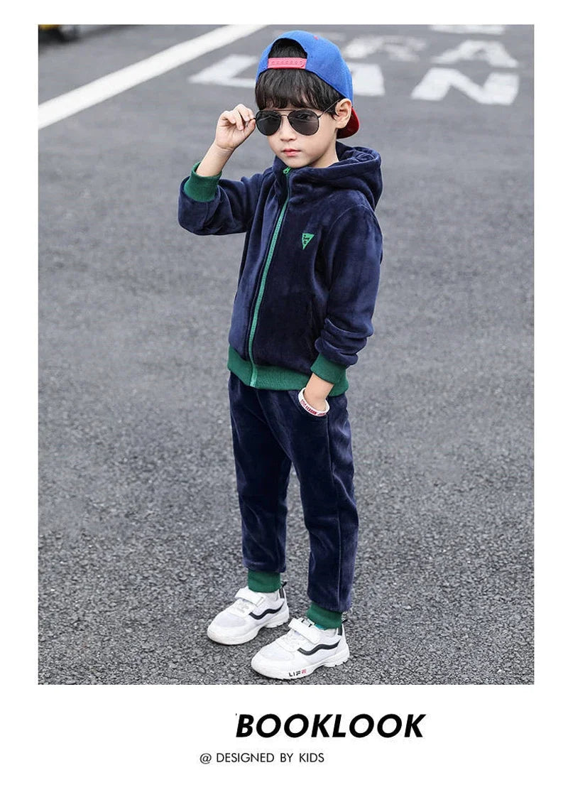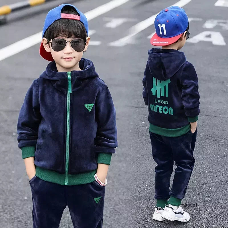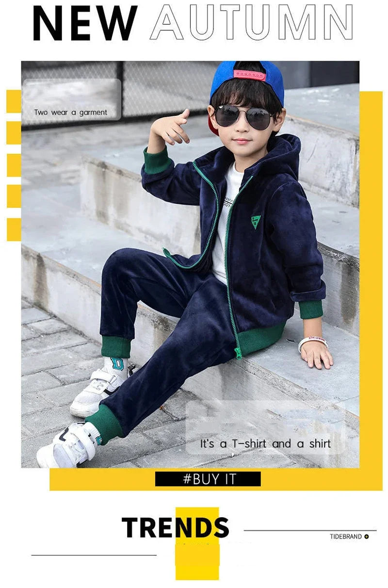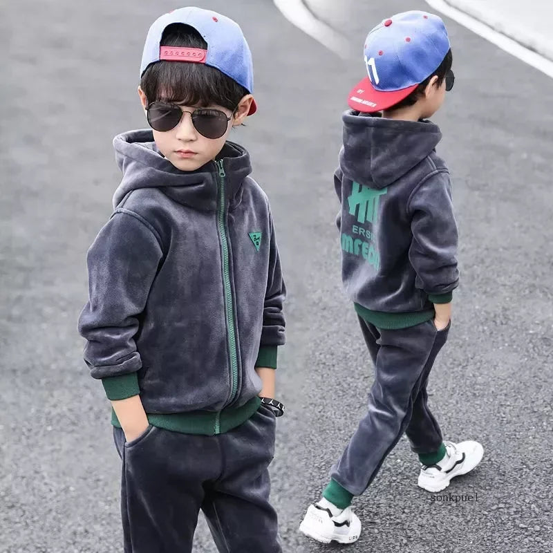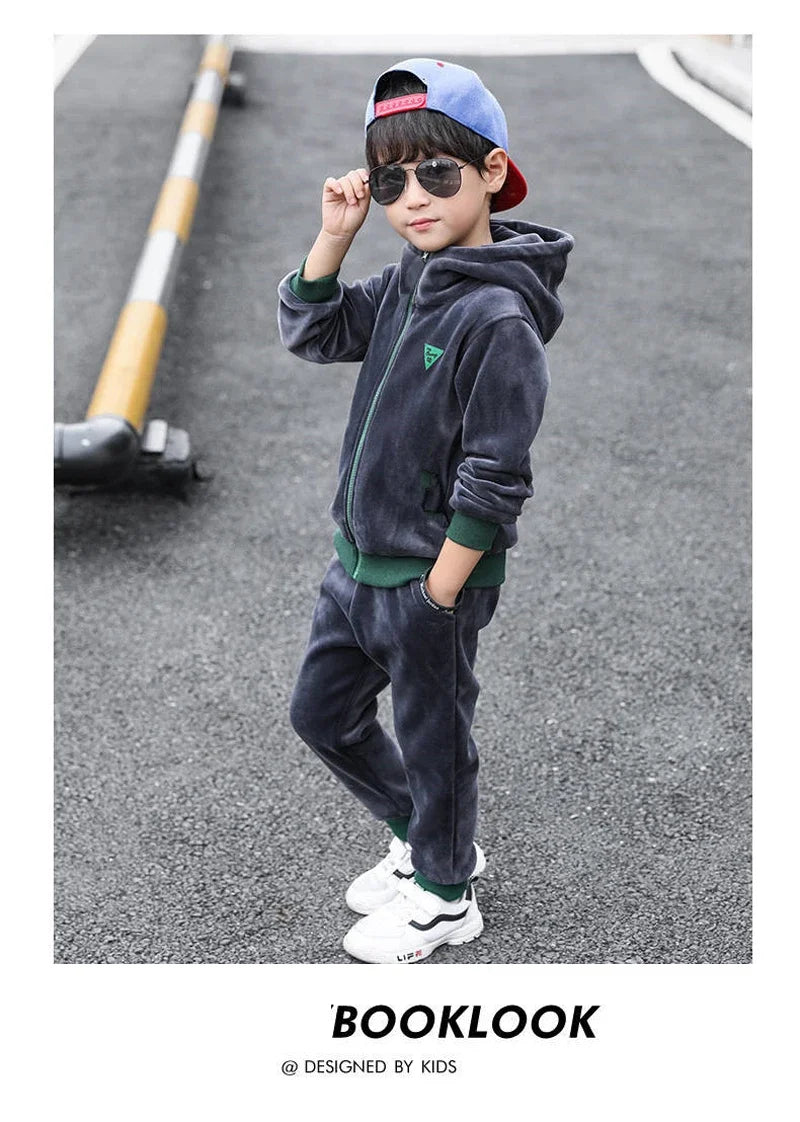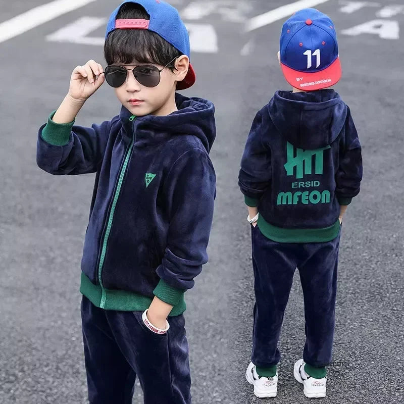 Children Clothing Set Double-sided Velvet Fashion Letter Hooded 2PCS Hoodies Coat +Pants Kids Boys Tracksuit for Autumn Winter