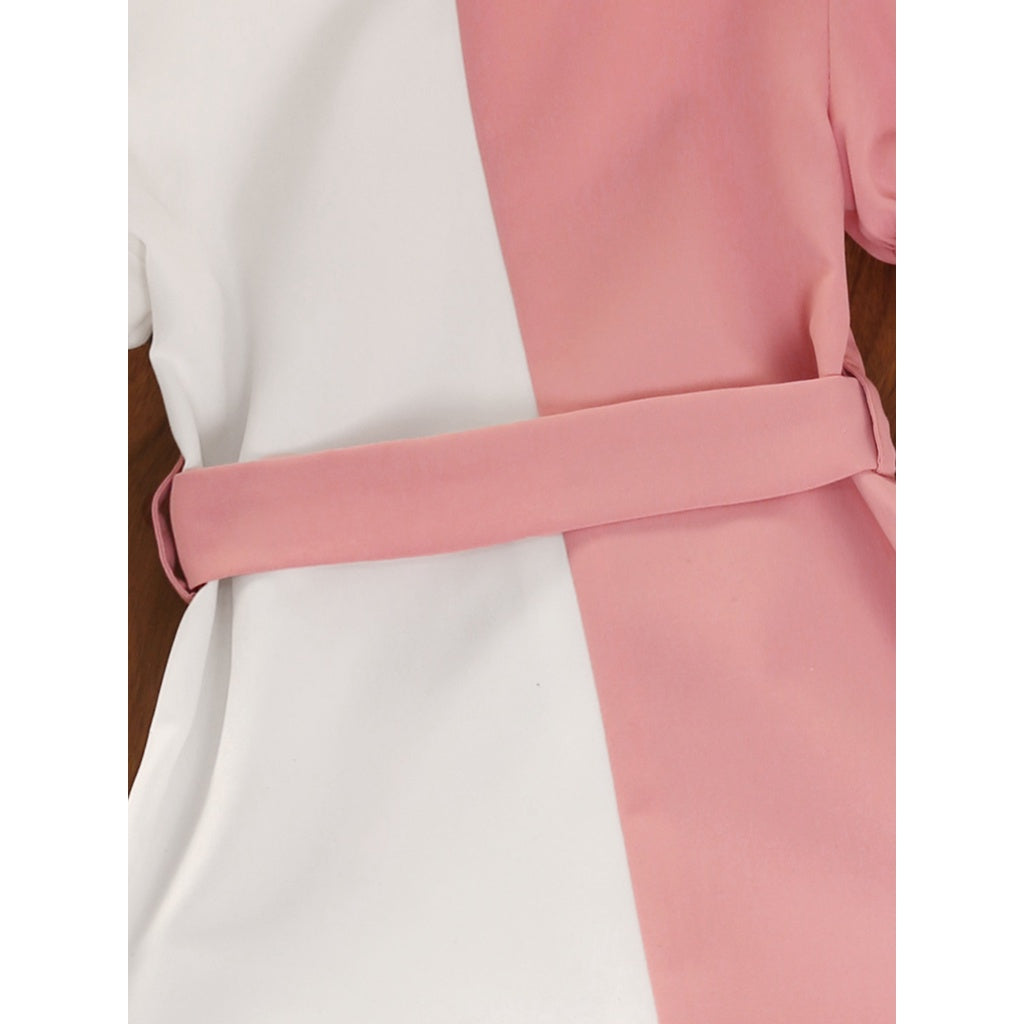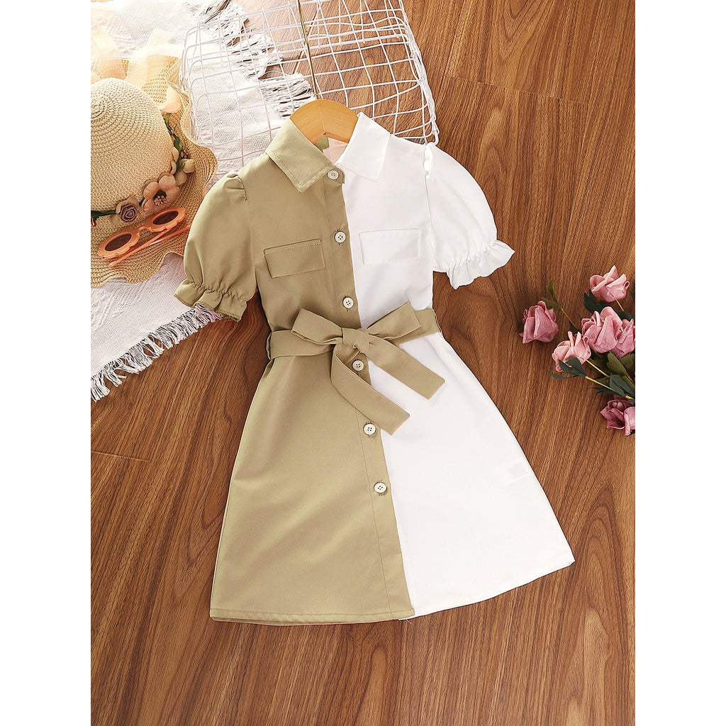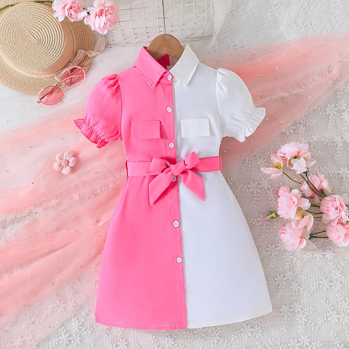 Dress For Kids 4-7 Years old Fashion Short Sleeve Princess Formal Button Stitching Dresses with Belt Ootd For Baby Girl