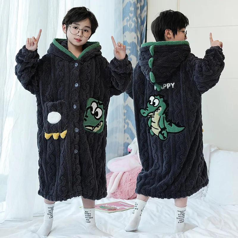 Kids Winter Bathrobe Thicken Warm Home Robe Baby Homewear Animal Dinosaur Cartoon Bathrobe For Children Hooded Gilrs Boys Robe