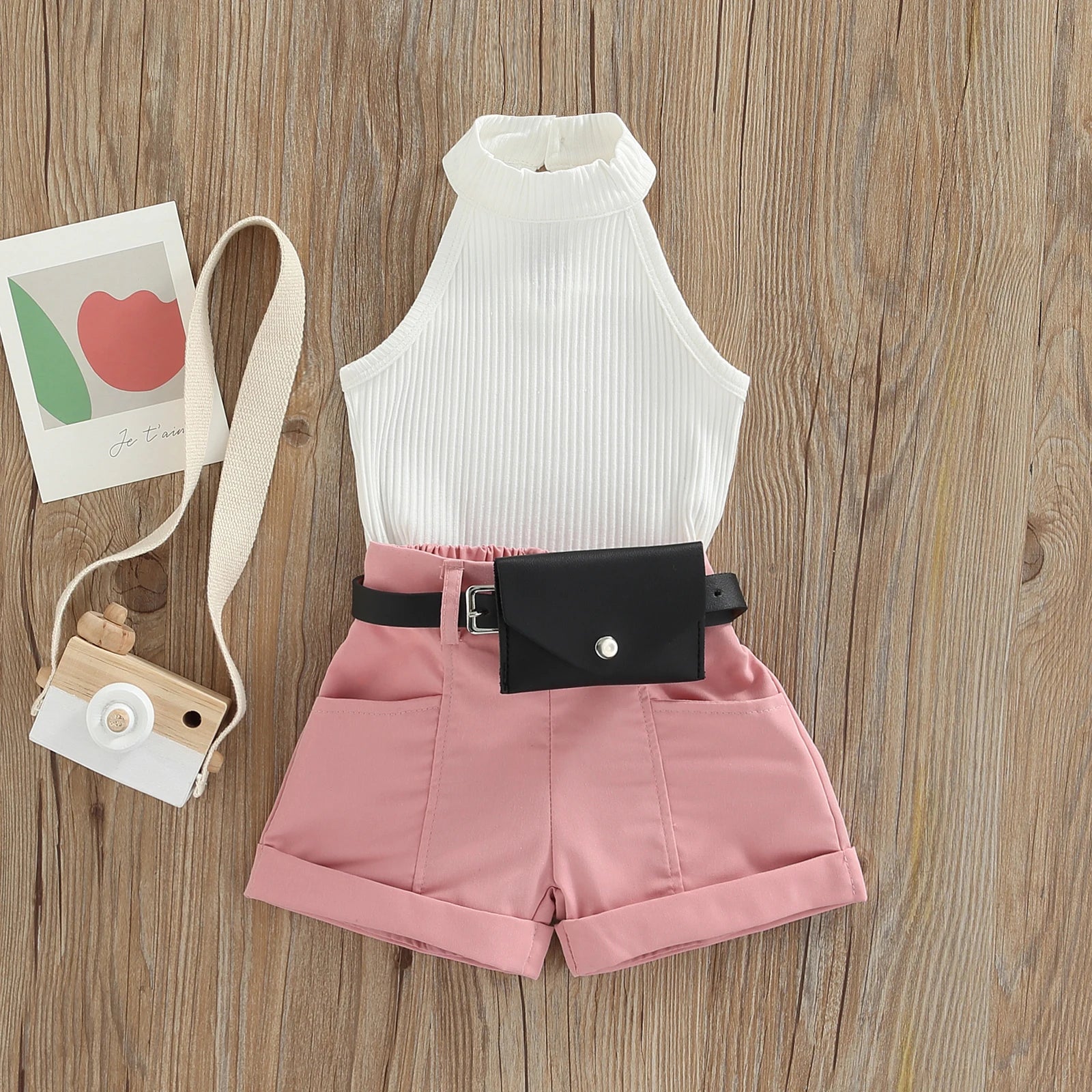 Little Girl Three-Piece Outfits Solid Color Sleeveless Ribbed Stand-Up Collar Tops + Belted Short Pants + Small Waist Pack 6M-4T