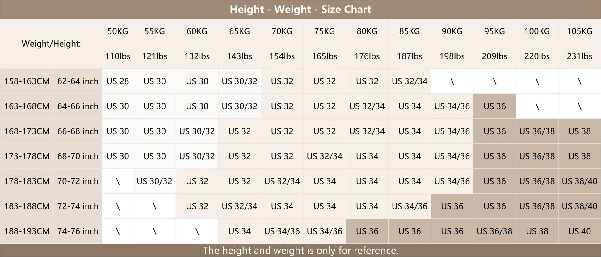 size_info: {"sizeInfoList":[{"length":{"cm":"75-86","inch":"29.53-33.86"},"size":"US 30 (CN M)","vid":-1},{"length":{"cm":"80-92","inch":"31.50-36.22"},"size":"US 32 (CN L)","vid":-2},{"length":{"cm":"85-98","inch":"33.46-38.58"},"size":"US 34 (CN XL)","vid":-3},{"length":{"cm":"90-104","inch":"35.43-40.94"},"size":"US 36 (CN 2XL)","vid":-4},{"length":{"cm":"96-110","inch":"37.80-43.31"},"size":"US 38 (CN 3XL)","vid":-5},{"length":{"cm":"102-116","inch":"40.16-45.67"},"size":"US 40 (CN 4XL)","vid":-6}]}
