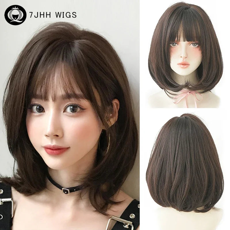 Pixie Cut Wigs Synthetic Short Straight Pink Brown Bob Wigs with Dark Roots High Density Layered Hair Wigs with Curtain Bangs